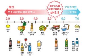 酸蝕歯は強い酸性の食べ物や飲み物などに歯がさらされることが原因です。
